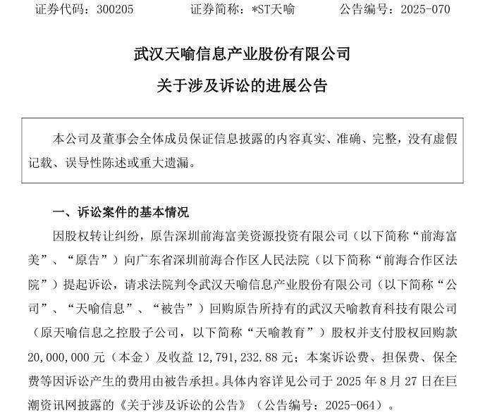 10月16日,*ST天喻(300205)发布公告股票配资知识网,因股权转让纠纷,原告深圳前海富美资源投资有限公司向法院提起诉讼,请求公司回购其所持有的武汉天喻教育科技有限公司股权,并支付股权回购款2000万元及收益1279万元。公告中提到,诉讼费、担保费、保全费等费用由公司承担。